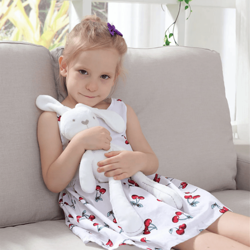 Tendre moment de douceur entre une petite fille et sa peluche lapin, compagnon de couchage adoré. Confortablement installée sur un canapé, elle serre contre elle ce lapin tout doux au regard apaisant. Sa texture moelleuse et ses longues oreilles en font un doudou parfait pour accompagner les enfants lors de la sieste ou du coucher. Un lien affectif fort se tisse autour de cette peluche rassurante, apportant sécurité, tendresse et réconfort au quotidien.