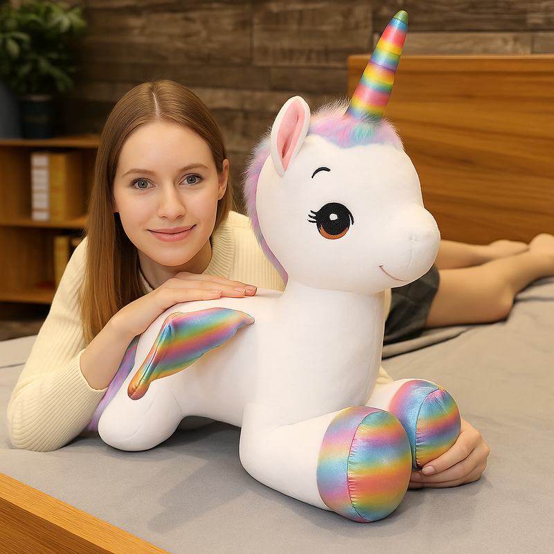 Une peluche licorne arc-en-ciel douce et câline, aux couleurs vives et scintillantes. Avec sa crinière multicolore et sa corne dorée, elle apporte magie et tendresse, idéale pour décorer ou réconforter petits et grands rêveurs.